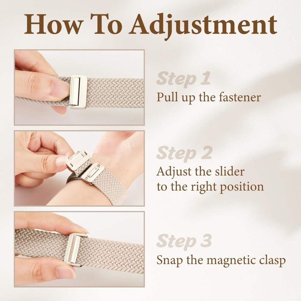 - Adjustable Clasp: This braided apple watch band uses adjustable strong magnetic closure to securely fasten the strap around the wrist. Solo loop design and stretchable nylon makes the band more easier to put on and take off. Suitable for wrist size 4.7″-8.9″